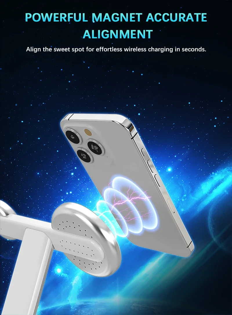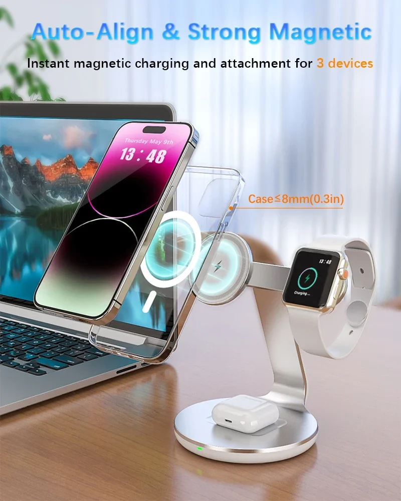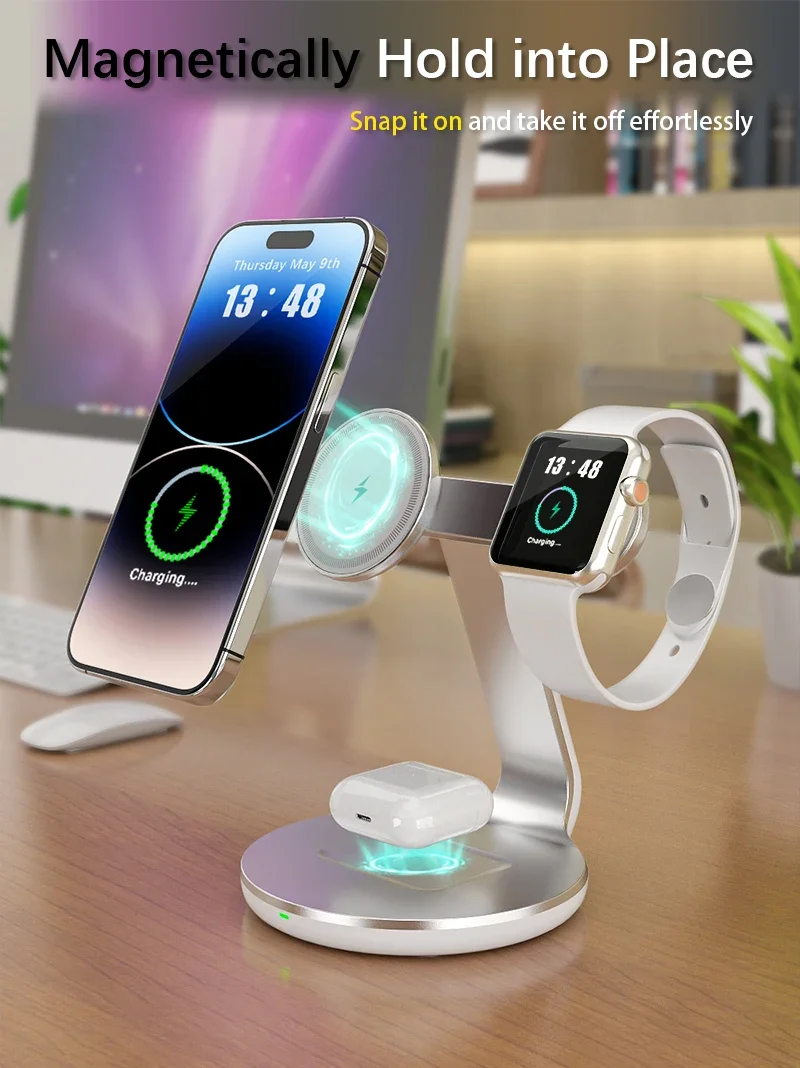 Upgrade your charging setup with the 30W 3-in-1 Magnetic Wireless Charger Stand — the ultimate all-in-one charging solution for your MagSafe iPhone, Apple Watch, and AirPods Pro. Designed with fast wireless charging, a stable magnetic connection, and a modern minimalist look, it keeps your devices powered and beautifully organized.