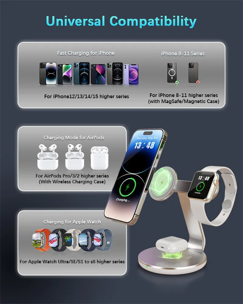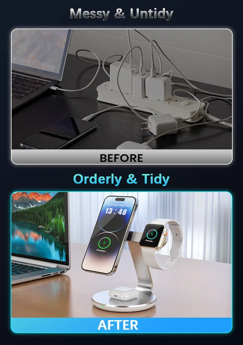 📱 3-in-1 Charging Station: Simultaneously charge your iPhone, Apple Watch, and AirPods Pro.