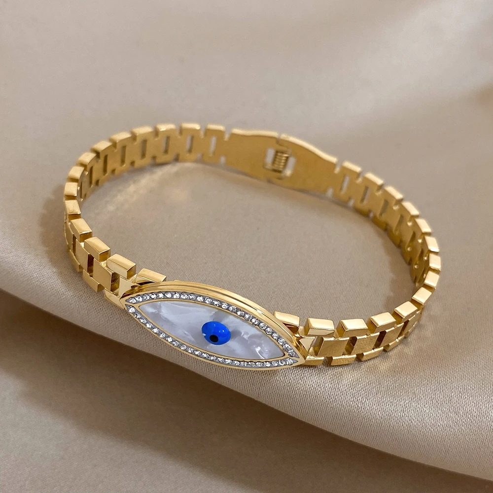 Trendy Rhinestone Shell Devil's Eye Stainless Steel Bracelet for Women Glossy Gold Plated Cuff Bracelets Waterproof Jewelry